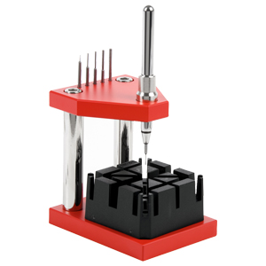 Kompletter Presstock mit Dornhaltebrosche zum exakten Führen des Stifthalters ohne zu verkanten. Der Untersatz aus synthetischem Material ermöglicht die Uhren mit Metallbändern in der gewünschten Position zu halten.