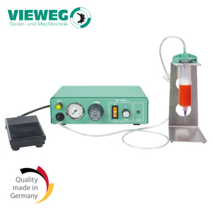 Das Dosiergerät der Serie DC 200 dient der präzisen Steuerung von pneumatischen Dosierungen, wie z.B. der direkten Dosierung von Medien aller Art aus Kleinkartuschen von 3 bis 80 ml. Ein Timer zur Einstellung einer Dosierdauer von 0,01 bis zu 31 Sekunden und ein Vakuumrückhaltesystem gegen das Nachtropfen niederviskoser Medien erlauben exakte wiederholgenaue Dosierung. Mit dem eingebauten Druckluftregler kann der Materialdruck exakt eingestellt werden.