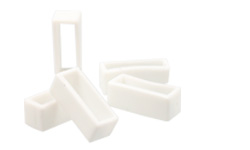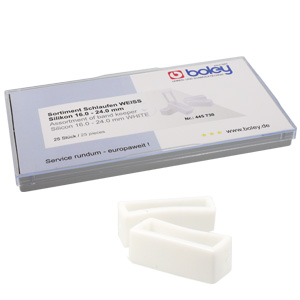 Set von weißen Silikonschlaufen, passend für Kautschuk-, Kunststoff- oder Silikonbänder in übersichtlicher Sortimentsbox.
