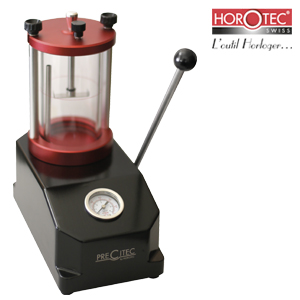 Das Wasserdichtigkeitsprüfgerät “Horotec AquaProof” ist ein Prüfgerät mit Wasser bei Überdrück zwischen 0,3 bis 6 bar. An einem separaten Lufteinlassanschluss auf der Rückseite des Gerätes kann wahlweise zusätzlich ein Kompressor oder eine Fusspumpe angeschlossen werden. Die Anzeige des Lecks erfolgt optisch über die aufsteigenden Luftbläschen.