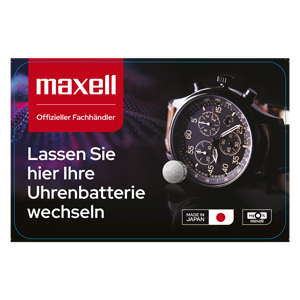 Newly designed window sticker from Maxell as a sign of a high-quality battery change with the inscription “Lassen Sie hier Ihre Uhrenbatterie wechseln”. They convey confidence and security in the quality of the Maxell brand.