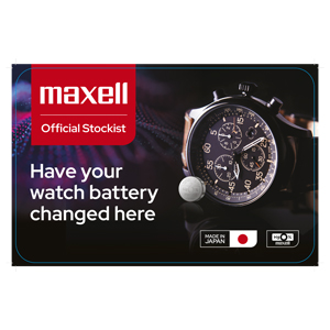 Newly designed window sticker from Maxell as a sign of a high-quality battery change with the inscription “Have your watch battery changed here”. They convey confidence and security in the quality of the Maxell brand.
