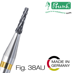 The tapered Busch carbide bur Fig. 38AU is made from ultra-fine grain tungsten carbide, densified through hot isostatic pressing at elevated temperatures. This manufacturing process gives the bur exceptional hardness, long service life, and outstanding cutting performance.